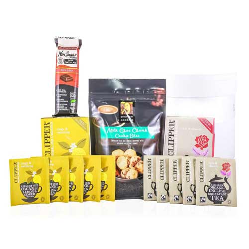 Afternoon Tea Hamper Included : Well Naturally Rich Dark, 5 Clipper Lemon & Ginger, 5 Clipper English Breakfast, BBCC Milk Choc Chunk Bites.