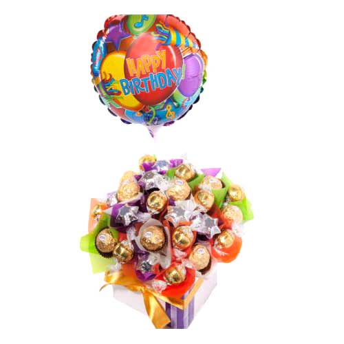 This Delicious Bouquet Of Creamy Milk And White Chocolate With A Happy Birthday Balloon.Happy Birthday Balloon,10 X White Chocolate Lindt Balls,10 X Ferrero Rocher Chocolates,10 X Silver Milk Chocolate Stars,.